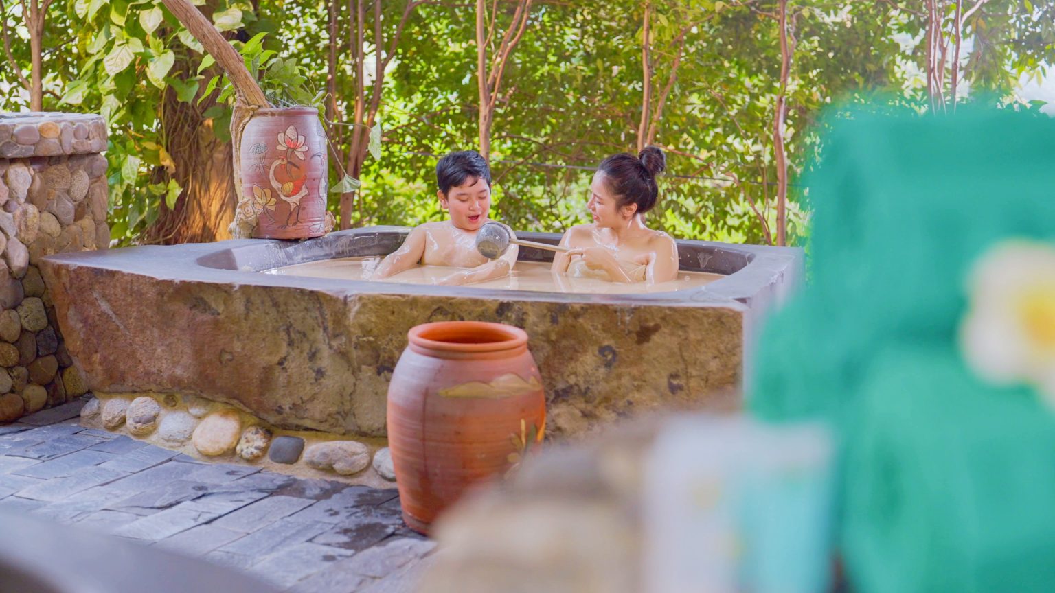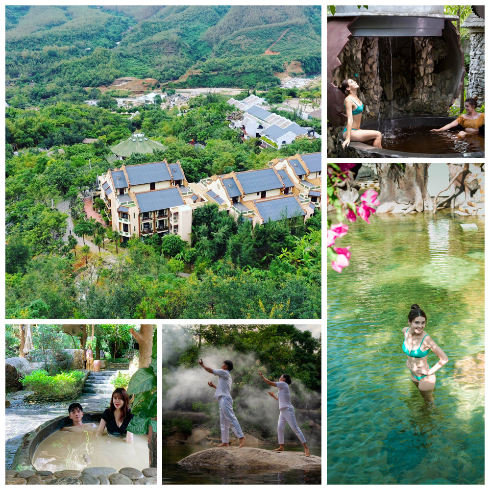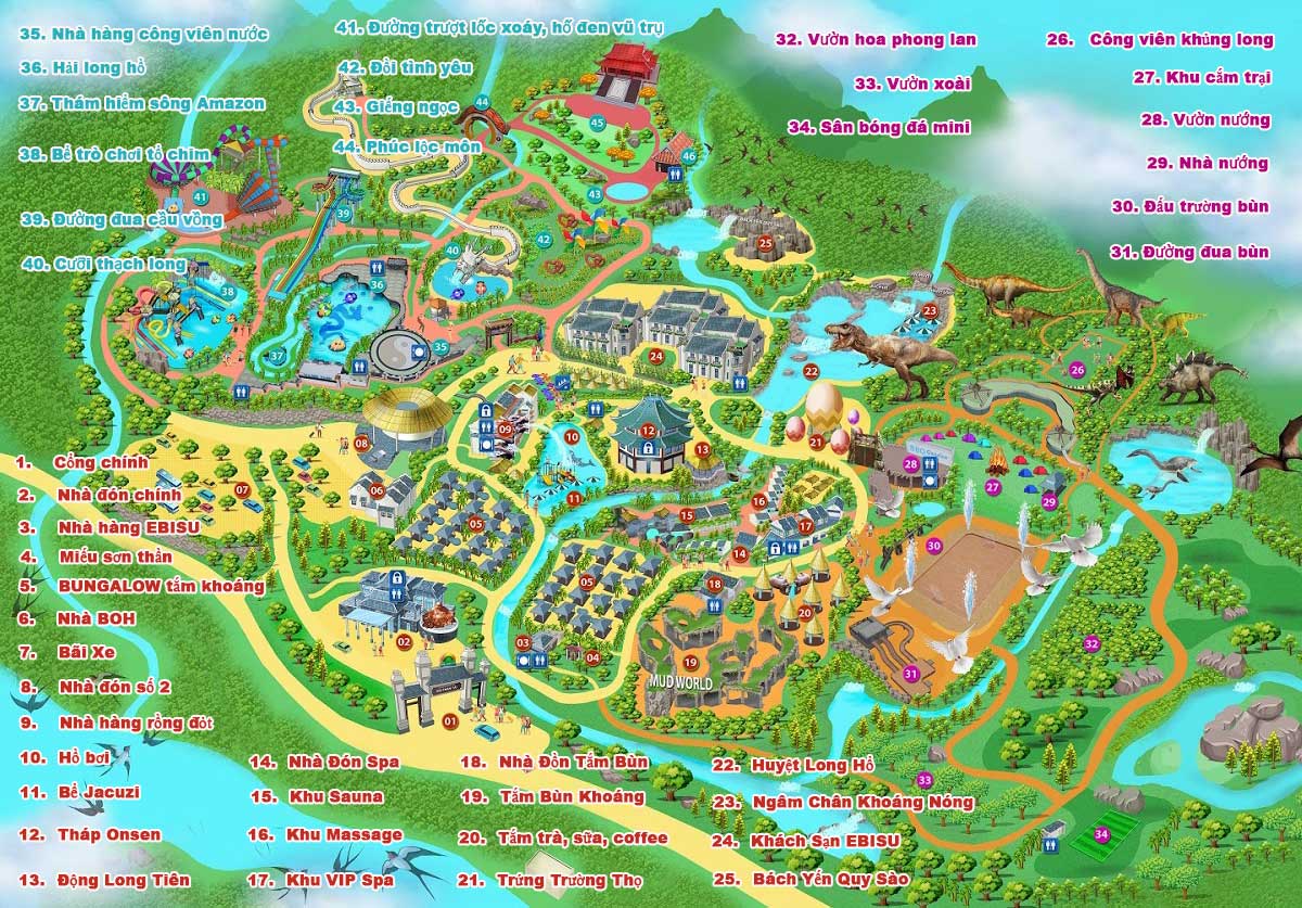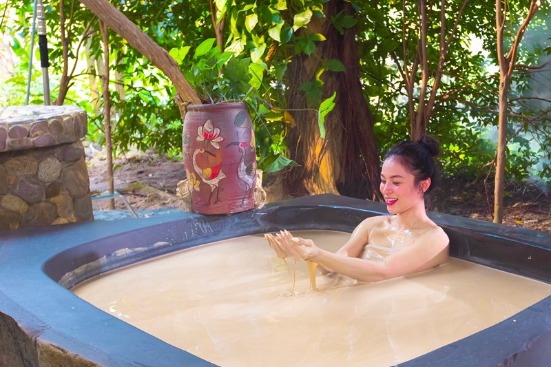 - 9:30 AM: Tramcar takes the delegation to the “BONG RONG” area with a large swimming pool and water games for children and adults. Here, you are free to take a mineral bath at the collective mineral bath area, in addition, you can add a mud bath, onsen bath, tea, milk, wine, and coffee bath (own expense). You boil eggs yourself at the hot mineral springs area, and participate in water games such as a lazy river, Long Tien cave, swimming pool, and outdoor play area,…